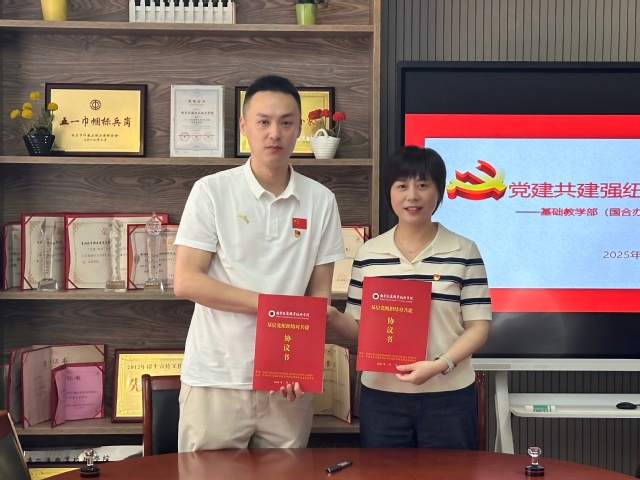 为构建“资源共享、优势互补、协同发展”的基层党建工作新格局,2025年5月28日上午,基础教学部(国合办)党总支与体育部直属党支部在明德楼414会议室举行党建共建结对签约仪式。双方以“党建共建强纽带'以体育人'筑同心为主题,签署《基层党组织结对共建协议书》,正式开启基层党组织协同育人新篇章。基础教学部(国合办)党总支副书记王黛碧、体育部直属党支部书记唐曹恺夫、两个部门的党员教师代表及留学生代表参加签约仪式。